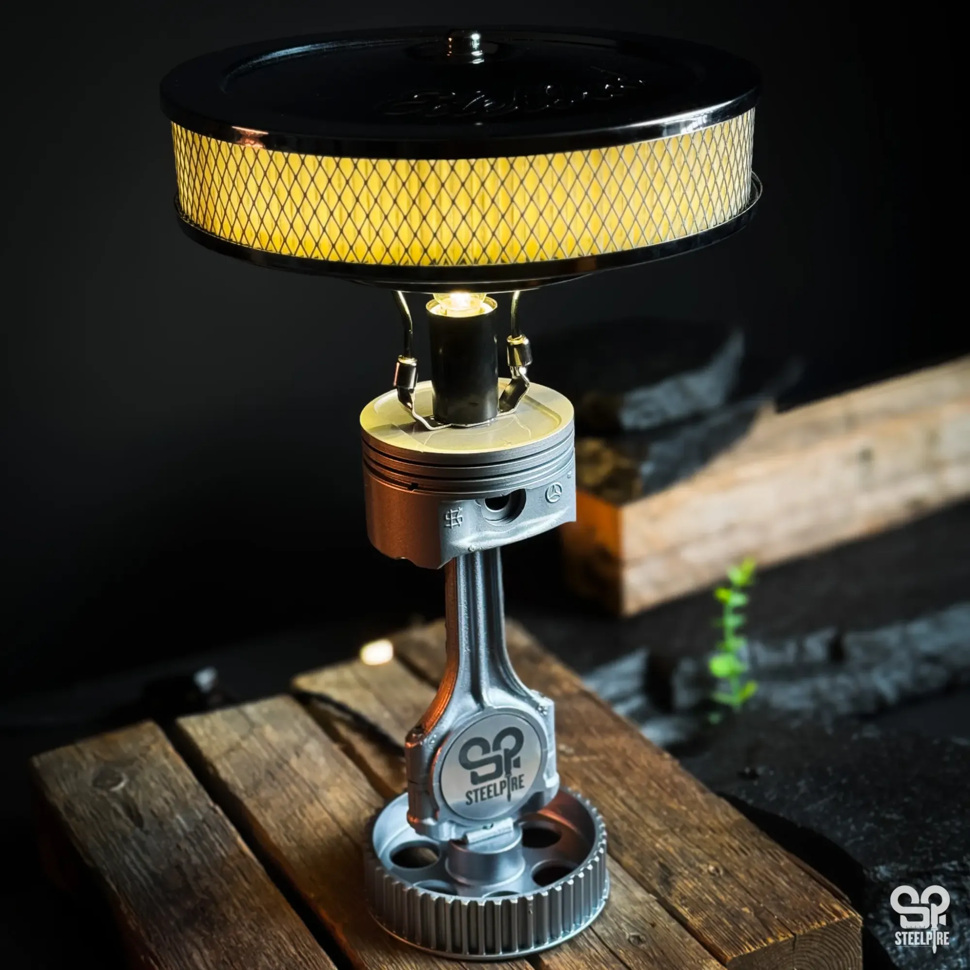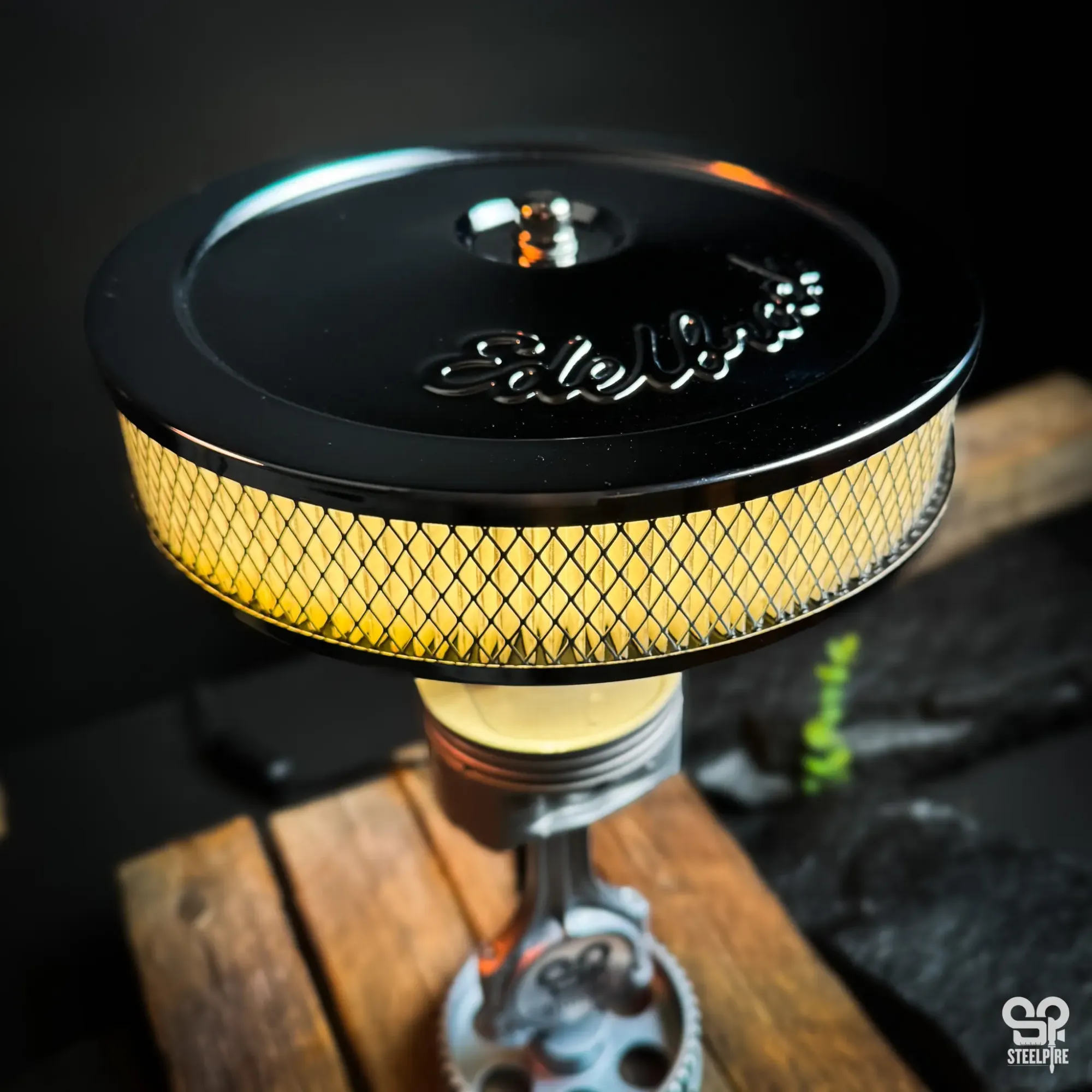 Egyedi asztali lámpa valódi autóalkatrészekből és egy eredeti amerikai Edelbrock légszűrőből.