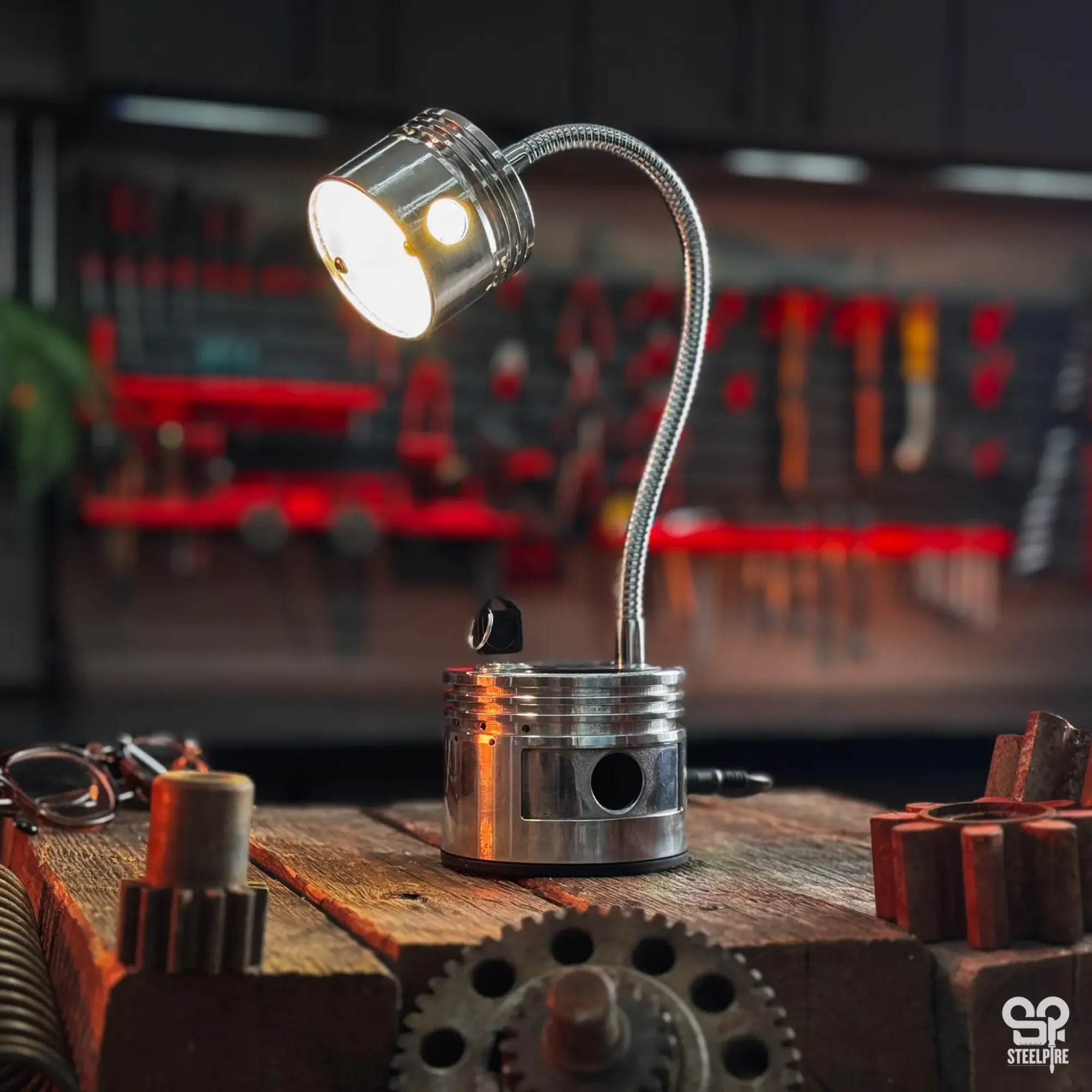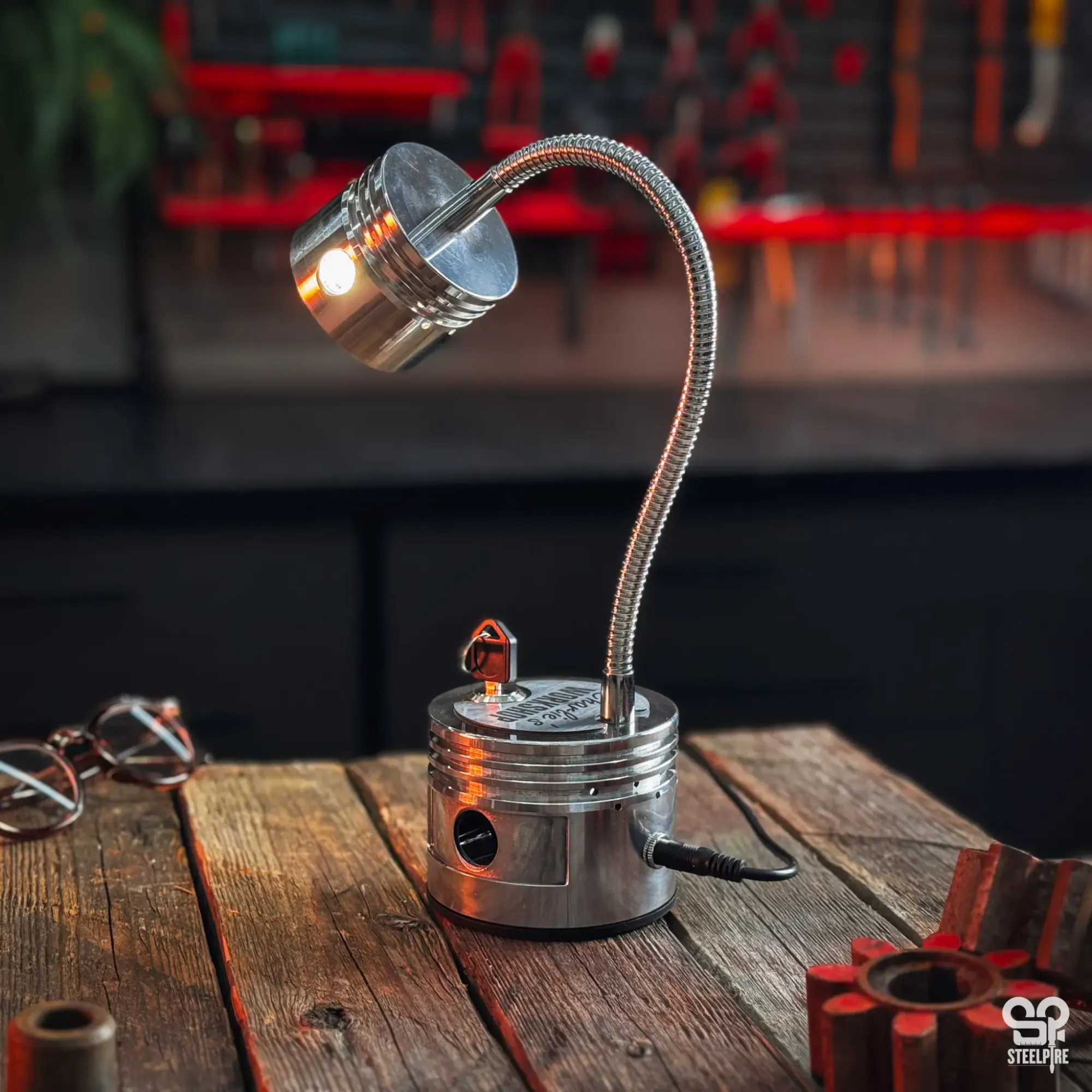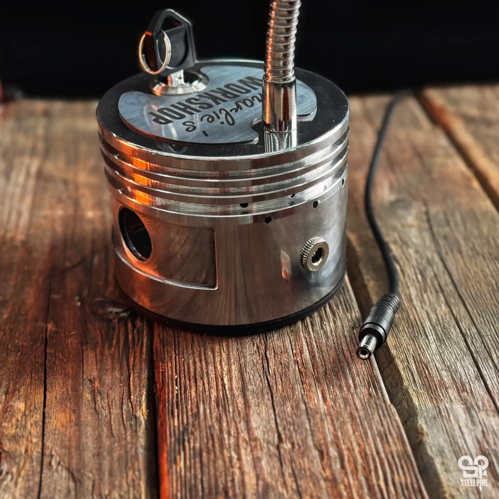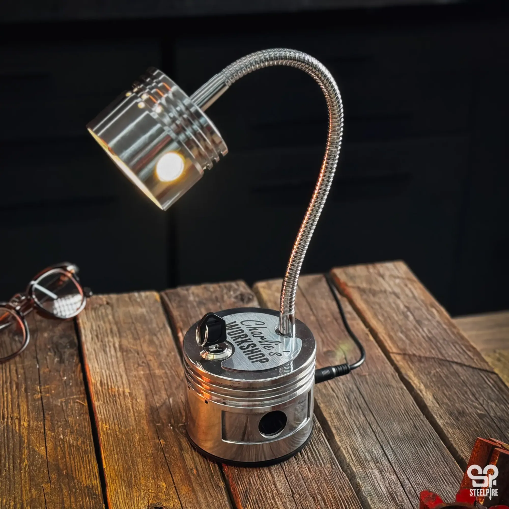 A distinctive desk lamp made from a real piston, for automotive enthusiasts. Customizable with unique engraving, 100% handcrafted. A character-driven addition to a desk or bedside, for those who see cars as more than just objects.