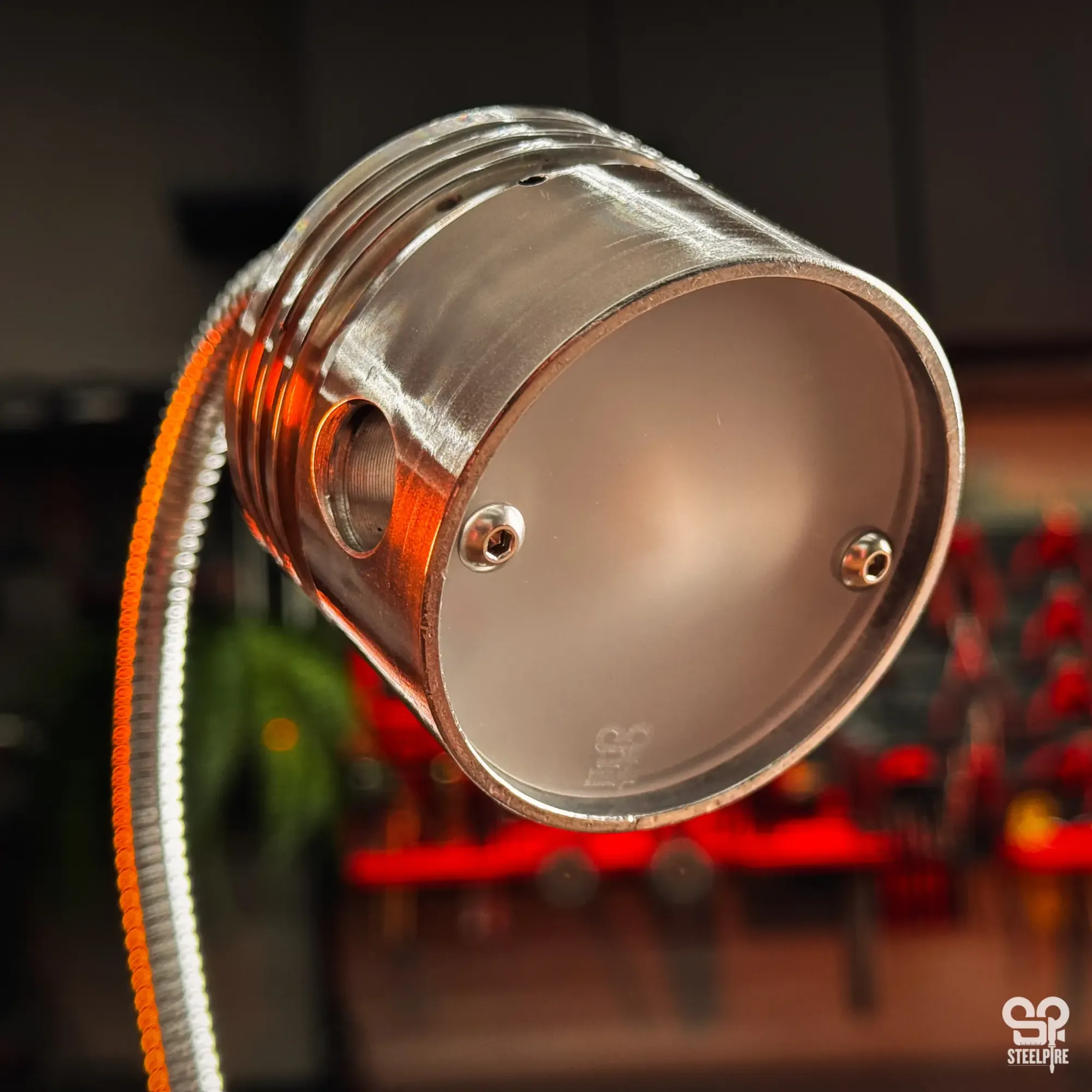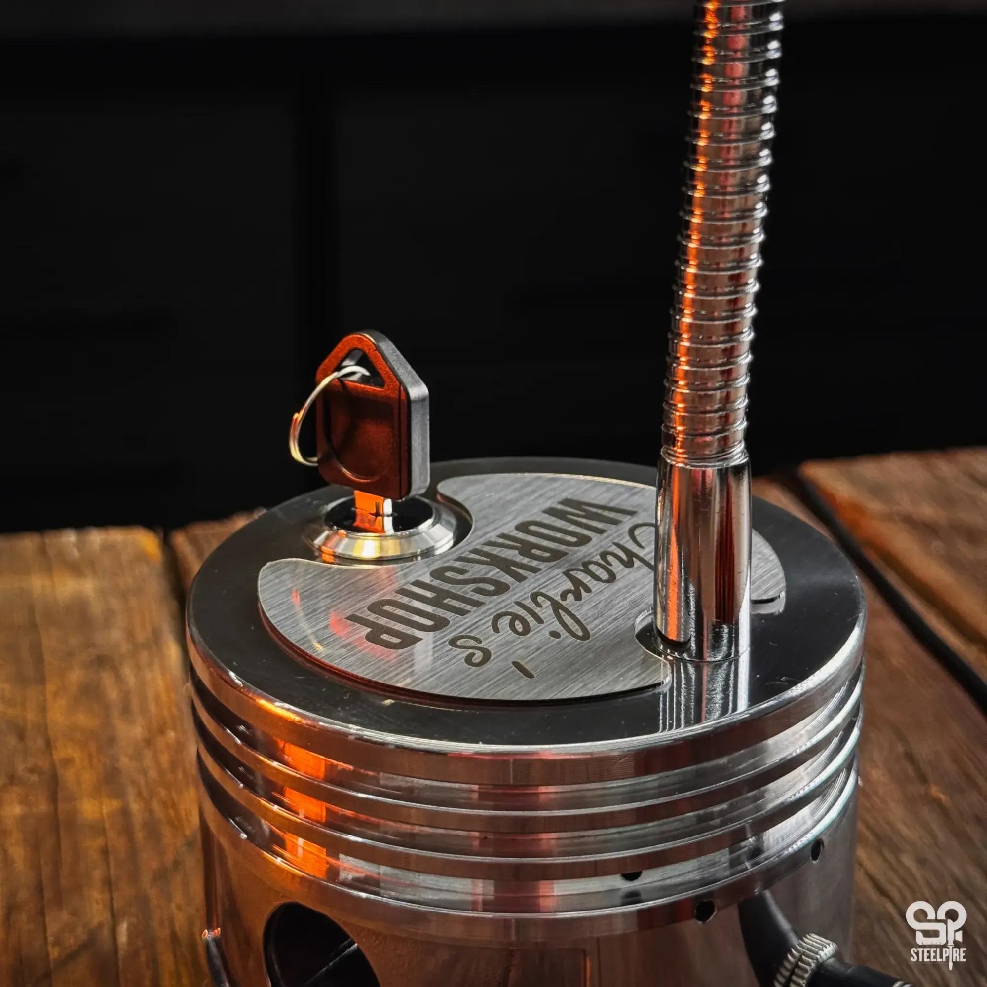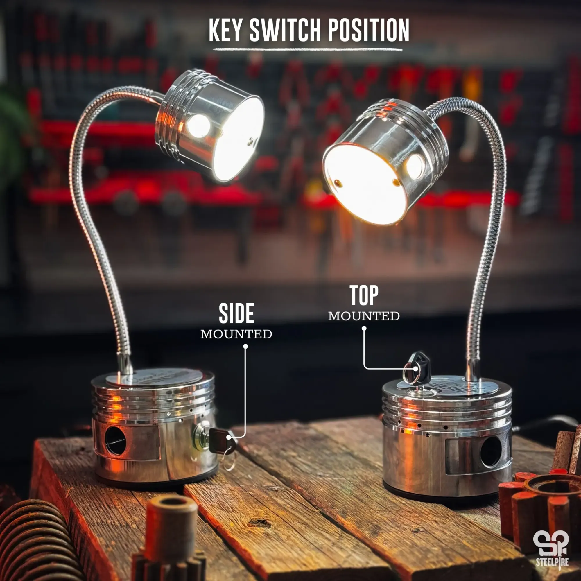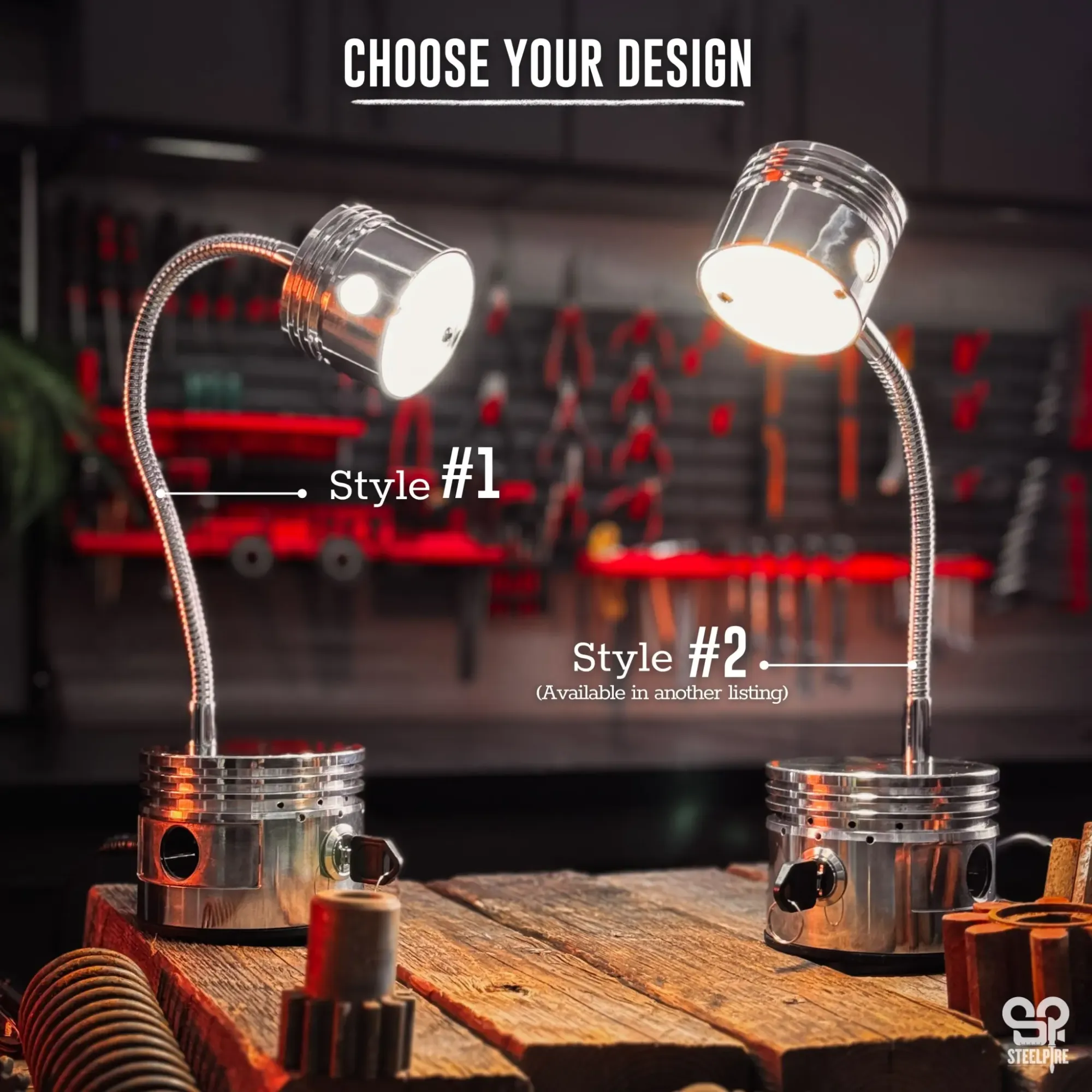 A distinctive desk lamp made from a real piston, for automotive enthusiasts. Customizable with unique engraving, 100% handcrafted. A character-driven addition to a desk or bedside, for those who see cars as more than just objects.