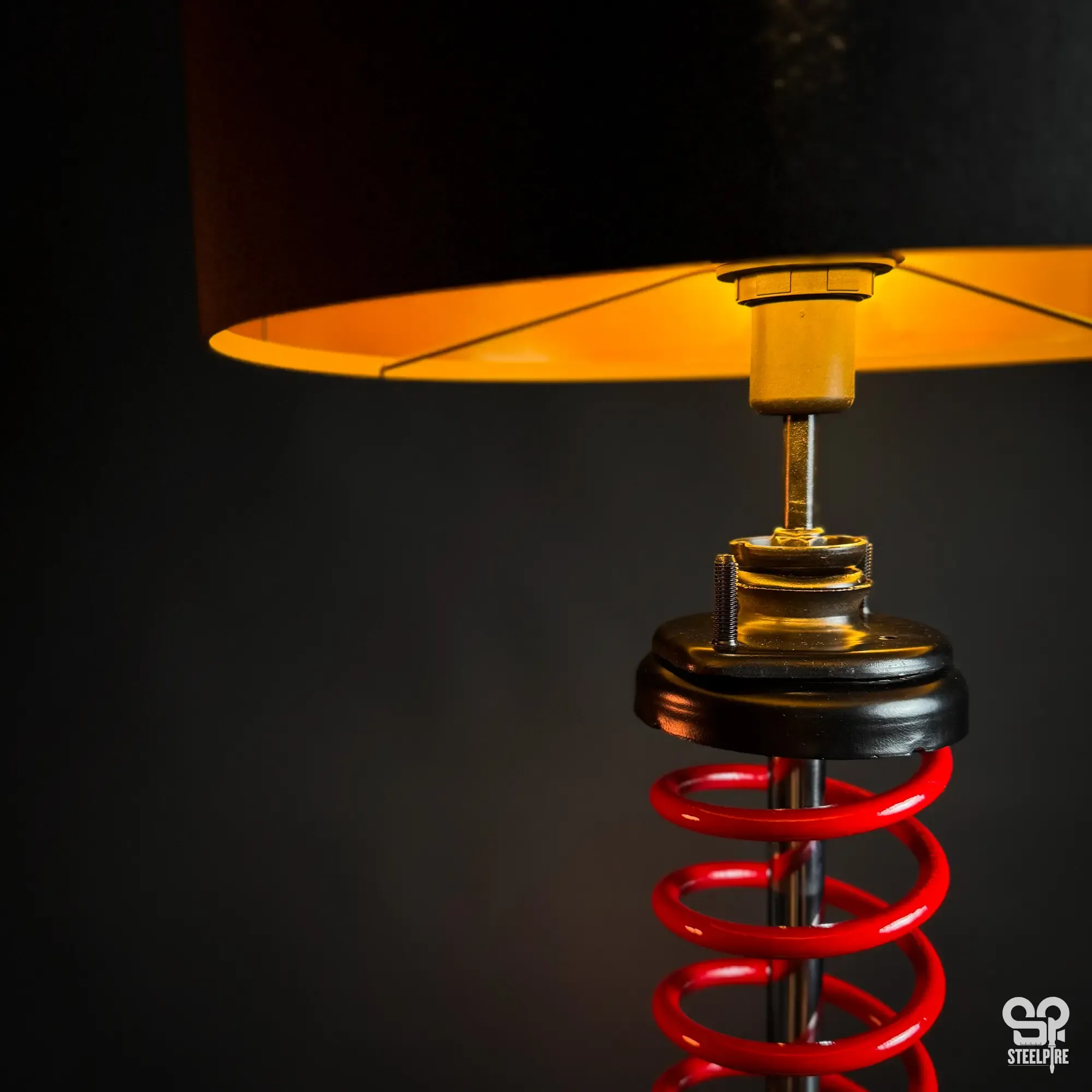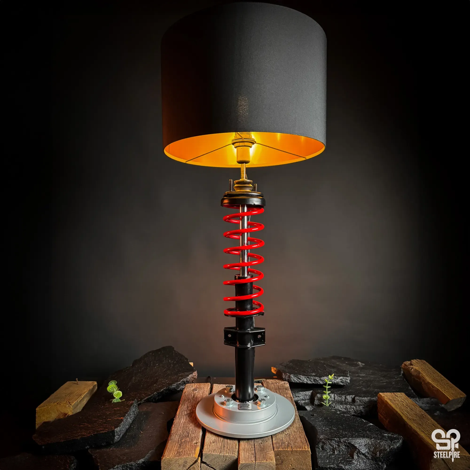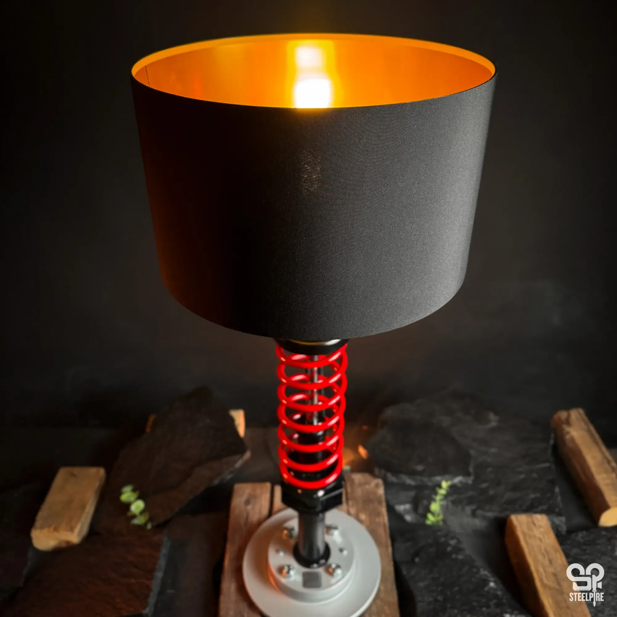 Egyedi asztali lámpa valódi autóalkatrészekből.