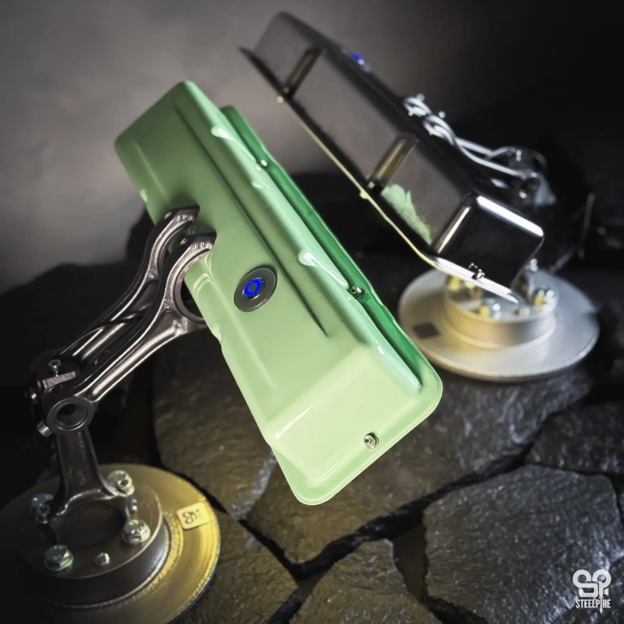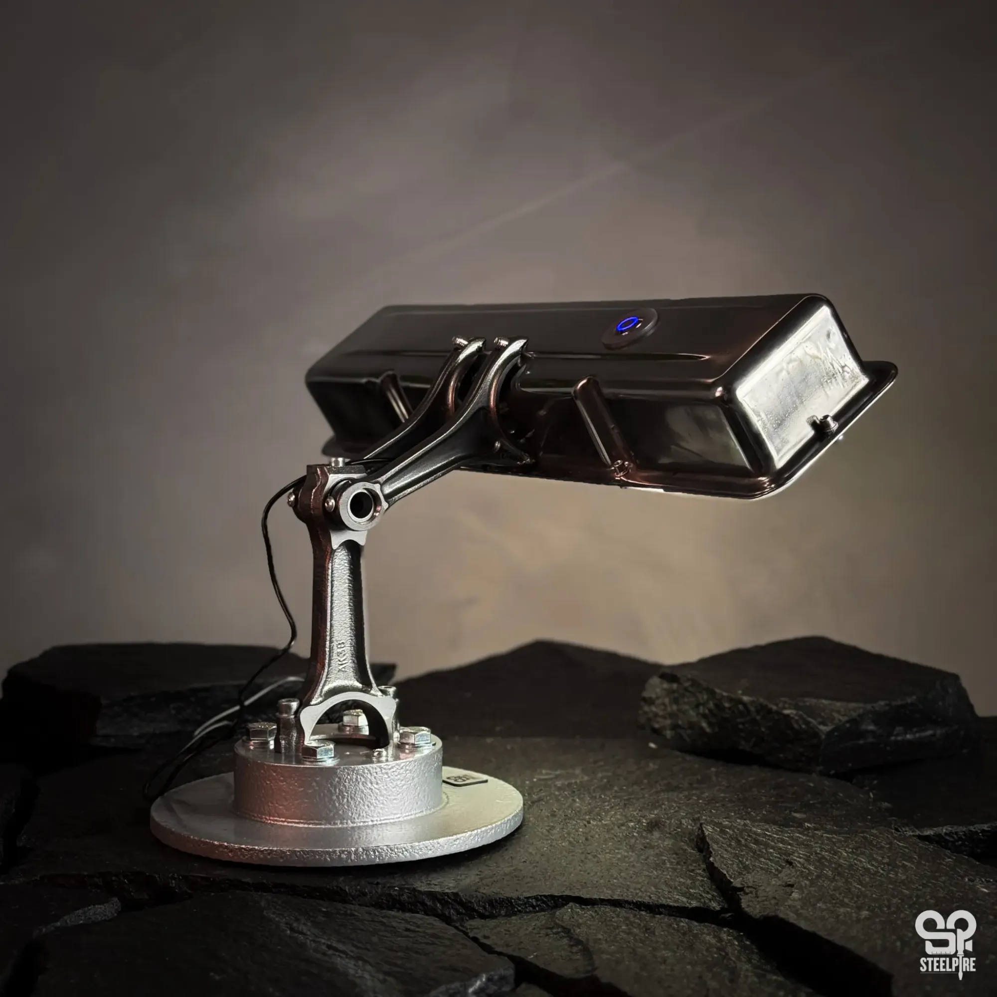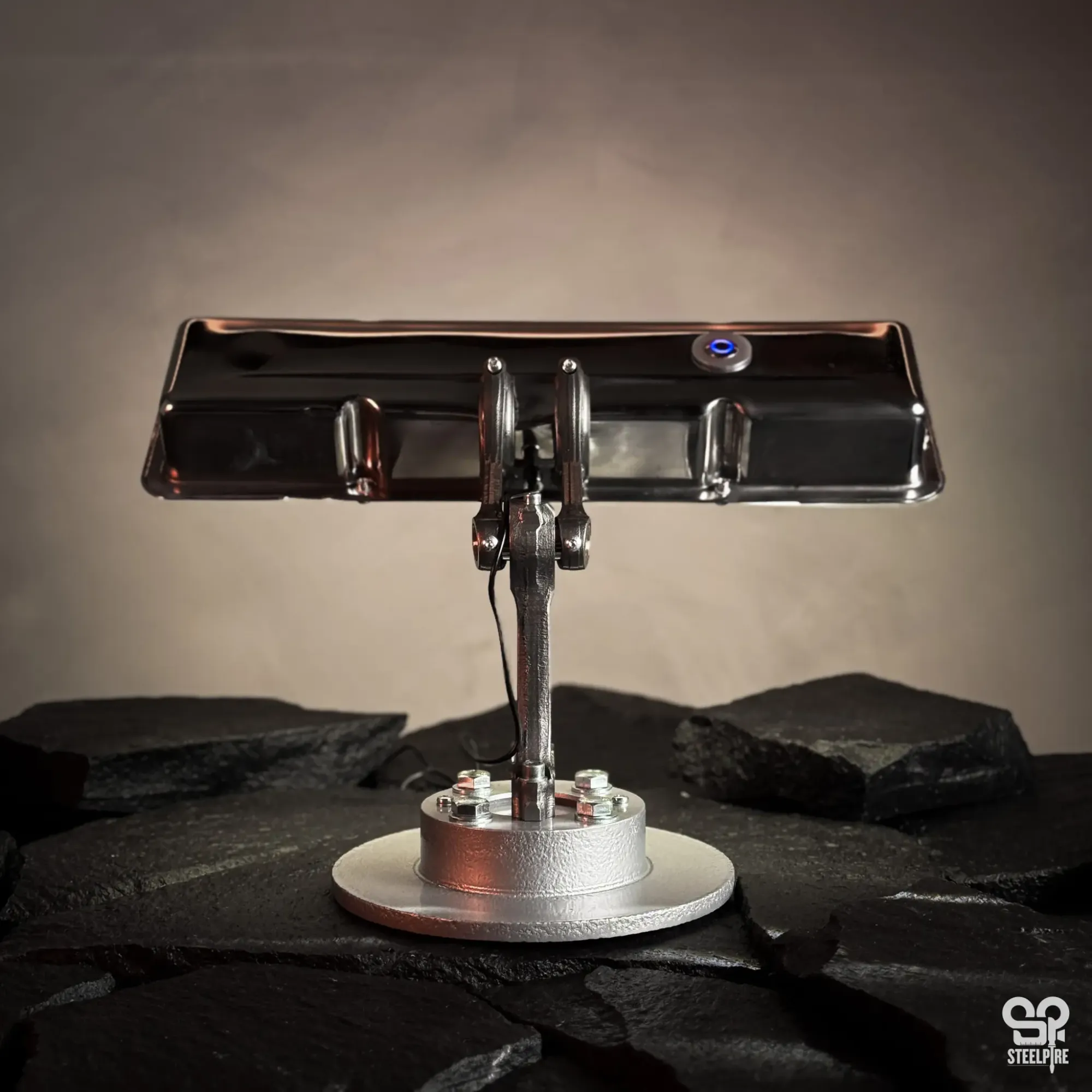 Egyedi asztali lámpa valódi autóalkatrészekből, small block V8 szelepfedél felhasználásával.